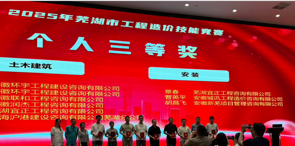 2025年9月19日,備受業(yè)界關(guān)注的2025年蕪湖市工程造價(jià)技能競(jìng)賽決賽圓滿落幕。安徽城訊工程造價(jià)咨詢選派的晉英平、汪煒同志憑借扎實(shí)的專業(yè)功底、精湛的實(shí)操技能從參加決賽的89人脫穎而出,榮獲獎(jiǎng)項(xiàng),其中晉英平同志獲得安裝個(gè)人三等獎(jiǎng)、汪煒同志獲得土木建筑個(gè)人優(yōu)秀獎(jiǎng),充分展現(xiàn)了安徽城訊公司同志們的過硬本領(lǐng)。